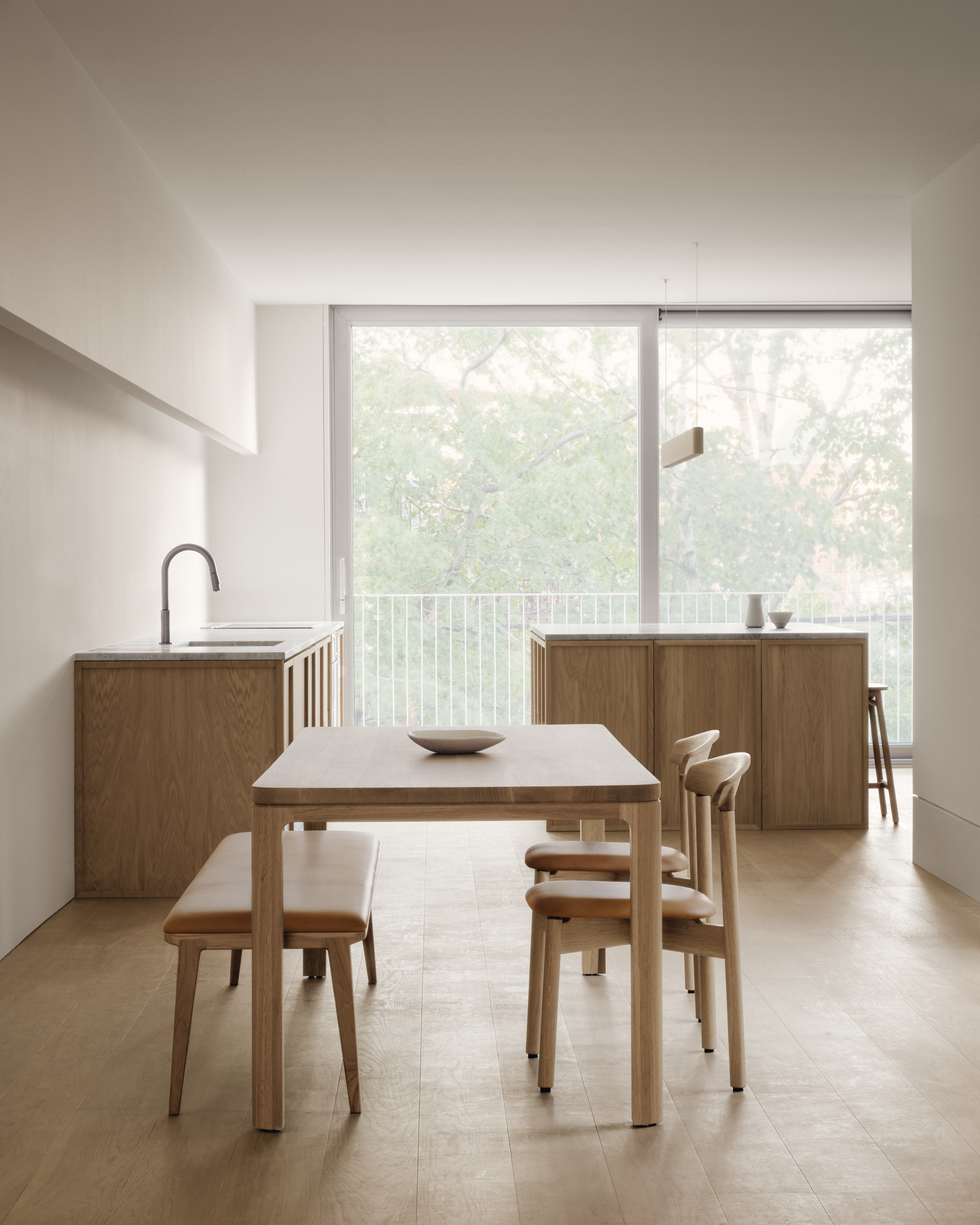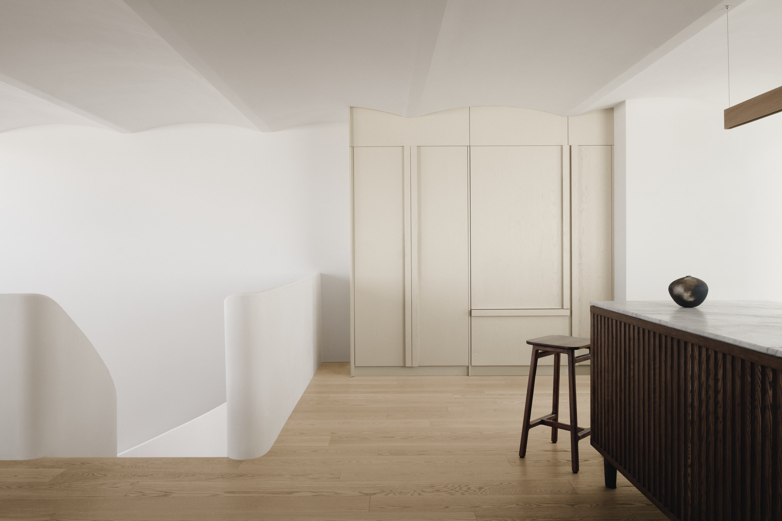 This Montreal triplex renovation combines soft tones and striking curved forms. The upper apartment boasts a massive freestanding spiral staircase that leads to a mezzanine floor. On the lower floor, the high ceilings are framed by an arched design that bathes the room in a gentle, reflected light. Vaste white-oak pieces are paired with the many oak accents within the spaces.