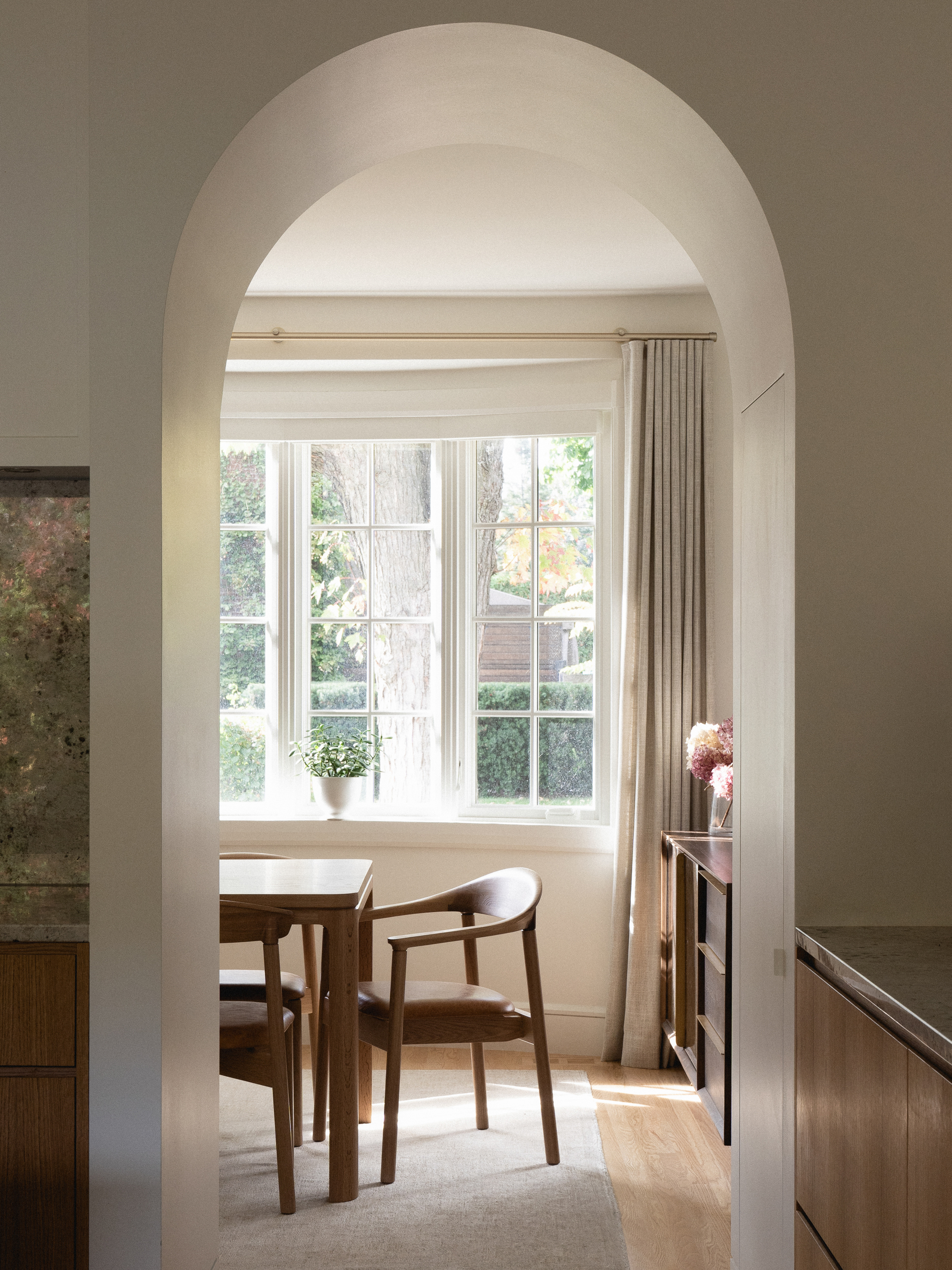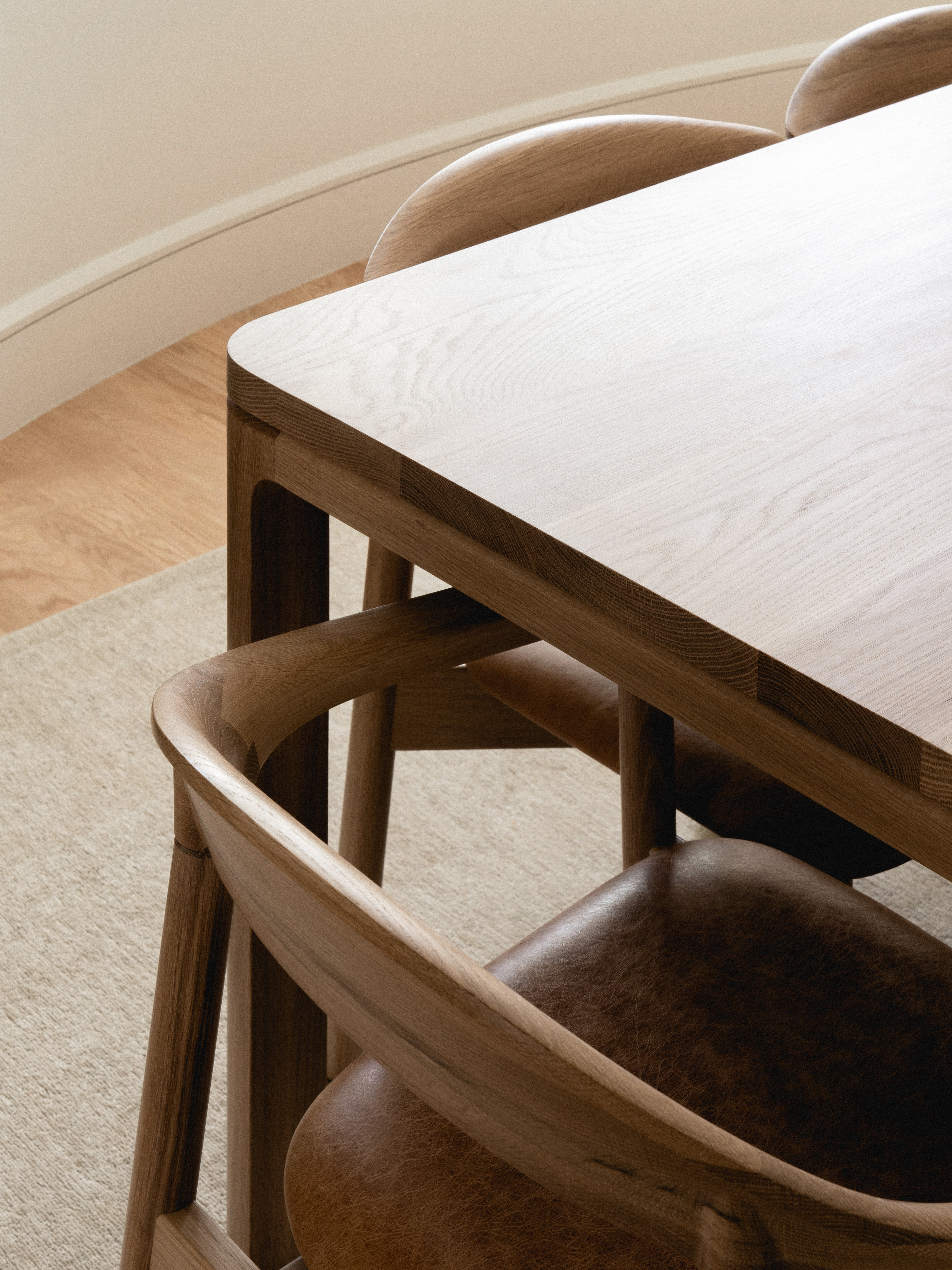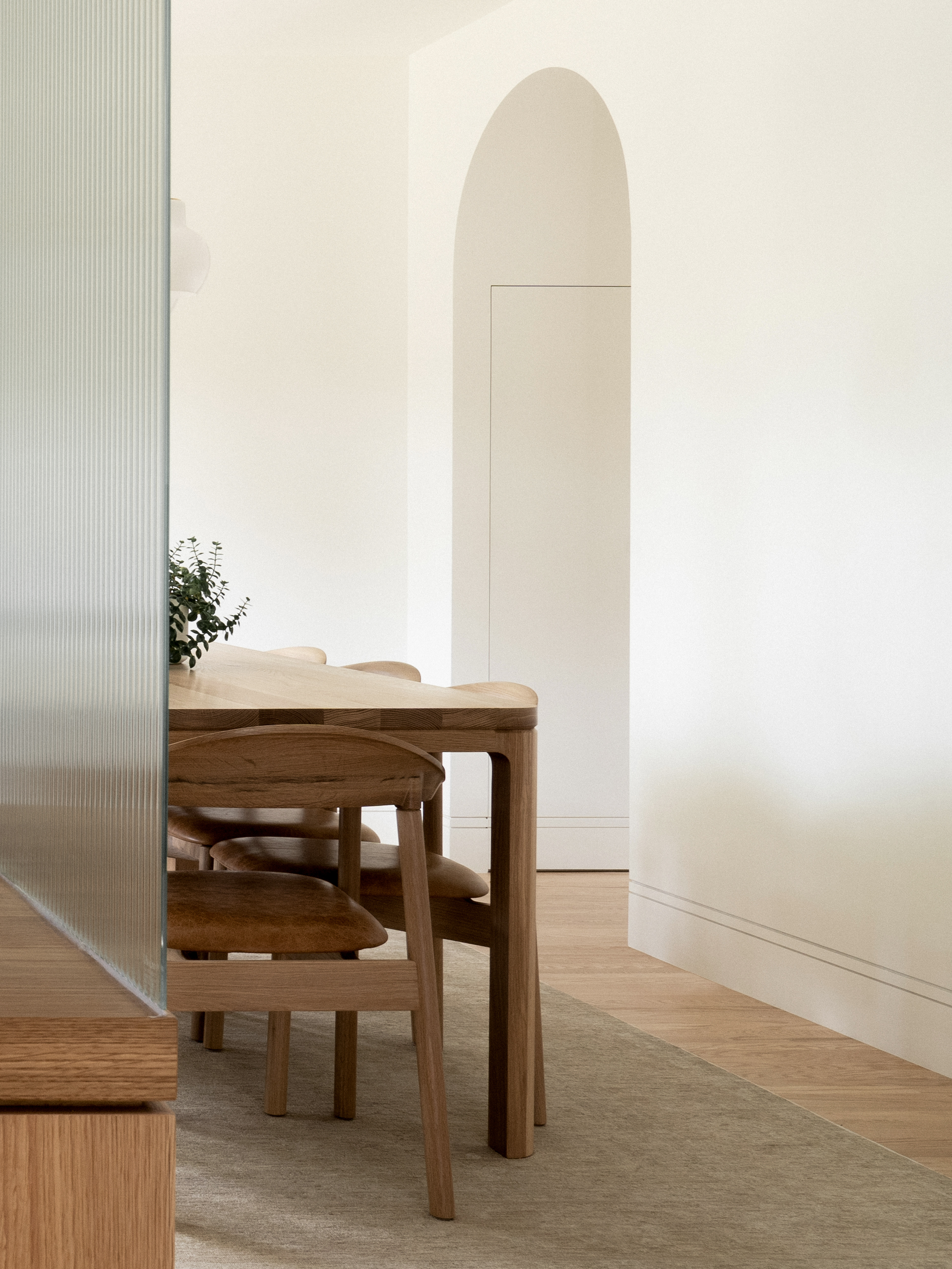 Le projet Dunraven revitalise une résidence des années 1940 dans la Ville de Mont-Royal, où une attention particulière a été portée afin de préserver les qualités d'origine de la maison tout en adaptant l'aménagement pour convenir aux nouveaux occupants. Un jeu subtil entre les détails architecturaux traditionnels et les sensibilités modernes crée un équilibre harmonieux. Les armoires de cuisine de style Shaker rendent hommage aux origines de la maison, tandis que les éléments en chêne apportent une touche contemporaine. Pour mettre en valeur l'intérieur chaleureux, la chaise Dune est revêtue d'un cuir sur mesure qui ajoute de la texture, tandis que les coins arrondis de la table font écho à l’élégance du couloir en voûte.